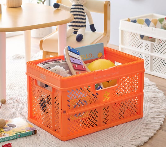 「Toffy マジックボックスハード〈バスケットタイプ〉」は、POPなデザインが目を引く、折りたたみ式のハンドル付きバスケット。耐荷重8.0kgのしっかりとしたつくりで、おもちゃや衣類、食材のストック保存をはじめ、買い出しやアウトドアの荷物入れとしても使いやすく、日常使いからアウトドアまで幅広く活躍します。組み立てて使用する際は、最大3段まで積み重ねが可能。使わないときはコンパクトに折りたたむことができるため、収納場所をとらず、すっきりと片づけられます。さらに、同シリーズの「Toffy つながるフラットカート」との相性も抜群。「Toffy つながるフラットカート」に載せて使うことで、荷物の出し入れや移動もラクに行うことができ、日常の持ち運びや収納をより快適にサポートします。