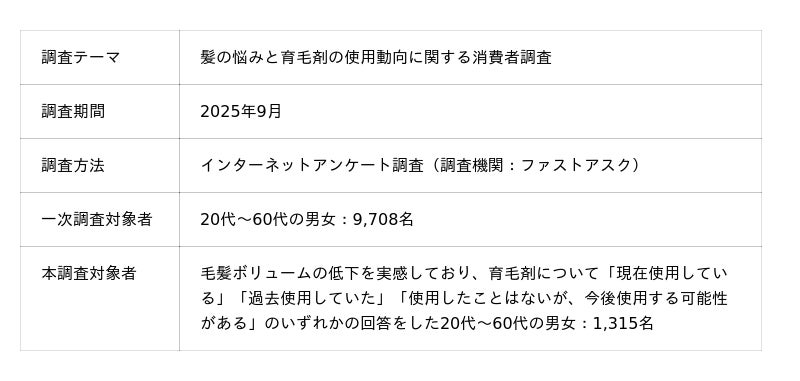 化粧品や健康食品の原料となる天然由来成分を製造する丸善製薬株式会社(広島県尾道市、代表取締役社長:日暮 泰広)は、20代~60代の男女を対象に、育毛剤の使用経験や購入手段、購入時のポイント、使用感の好み、使用期間などについてインターネットアンケート調査を実施しました。