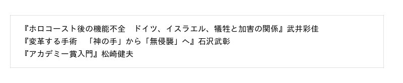 機能不全に陥った世界の構造を、国籍、裁き、国際法、償い、言葉と認識という5つの視点から歴史学者が解きほぐす『ホロコースト後の機能不全 ドイツ、イスラエル、犠牲と加害の関係』(武井彩佳)、激動の四半世紀に立ちあった現役医師が、業界の秘史と現在地を余さず語り、「未来のオペ」への道筋を示す『変革する手術 「神の手」から「無侵襲」へ』(石沢武彰)、アカデミー賞の誕生から、激動の現代までを読み解く入門書『アカデミー賞入門』(松崎健夫)が登場! ぜひこの機会にお手に取りください。