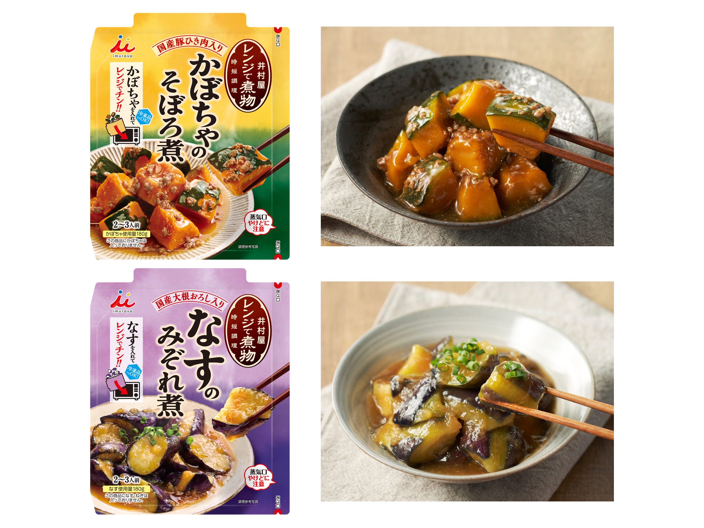 「レンジで煮物 かぼちゃのそぼろ煮・なすのみぞれ煮」商品特長