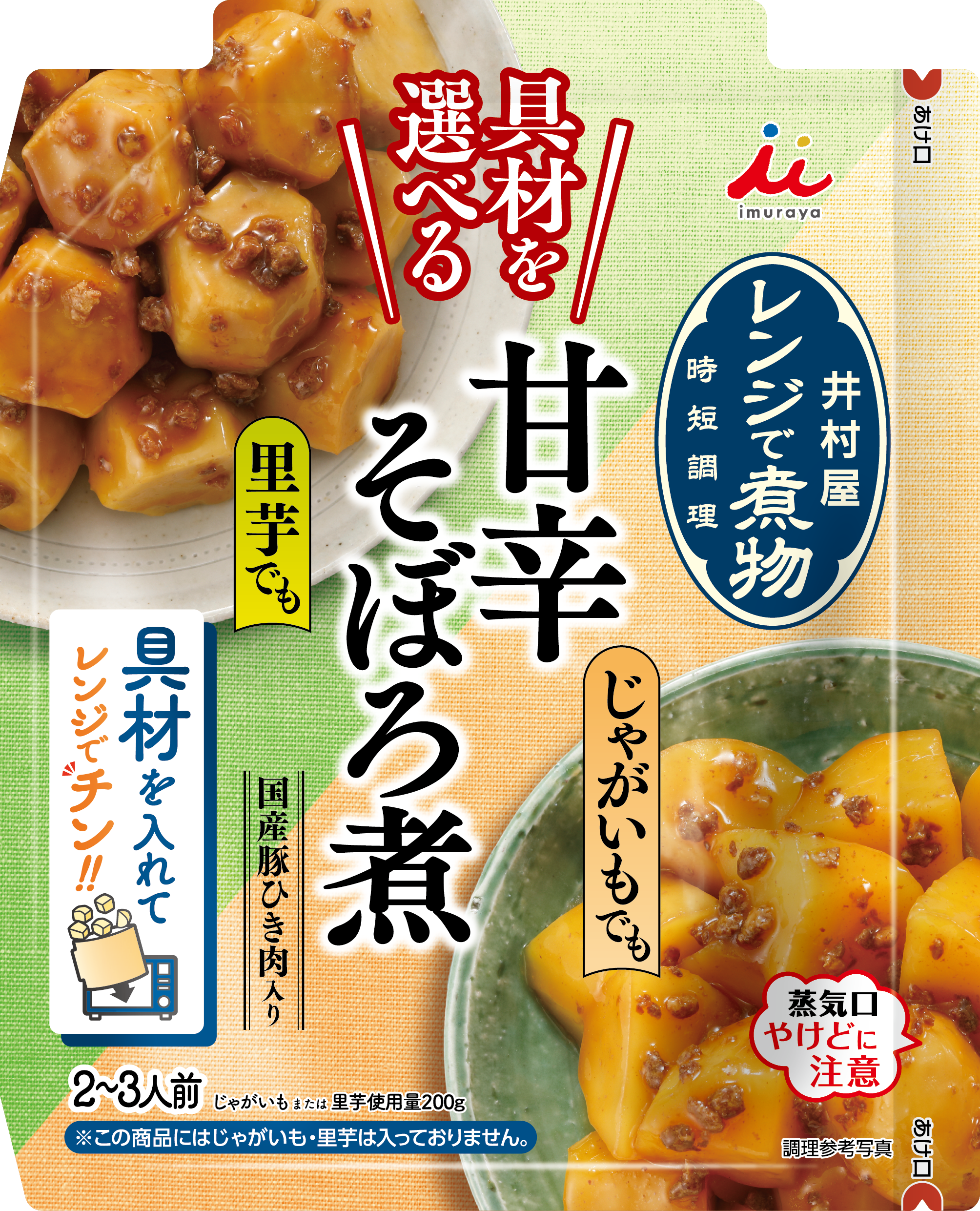 具材を選べる レンジで煮物 甘辛そぼろ煮1商品で2つのレシピ提案!じゃがいもまたは里芋を好みに合わせて選べます。