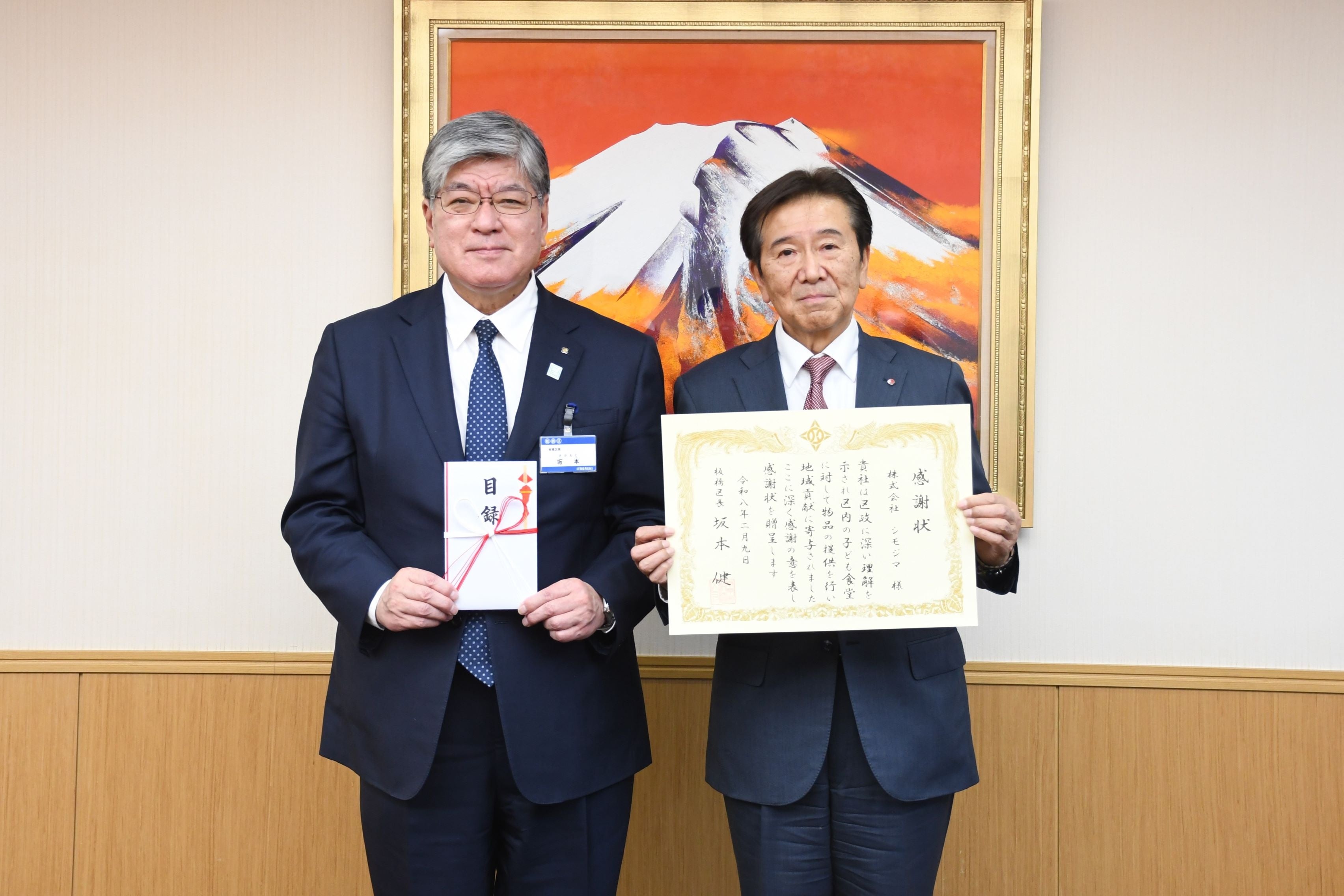 坂本区長(右)と笠井代表取締役社長(左)