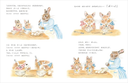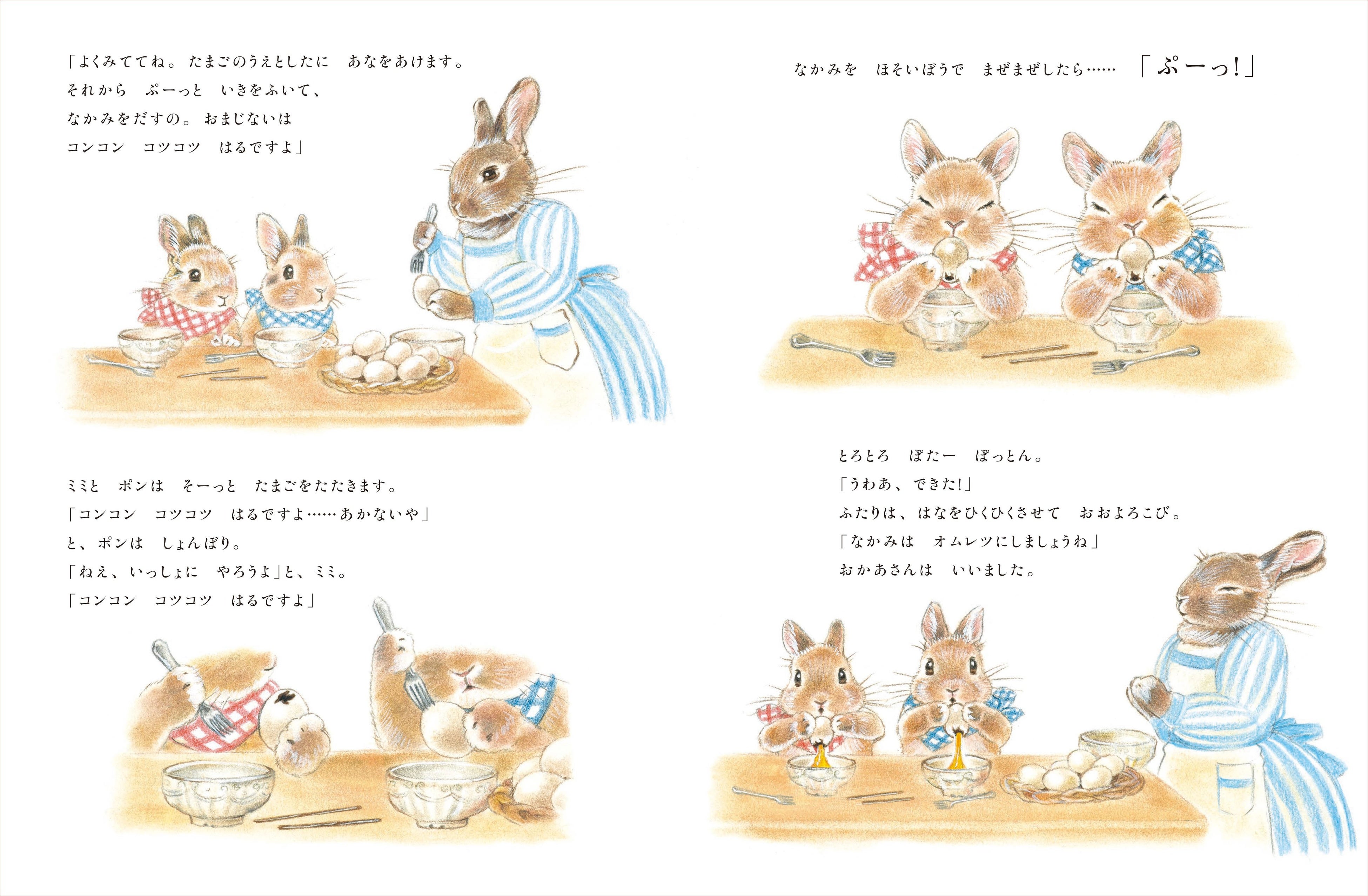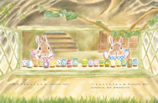 ふたごうさぎのミミとポンは、ことしはじめての「イースターうさぎ」のおとうばん。イースターエッグをつくったり、エッグハントのじゅんびをしたりと、大いそがしです。