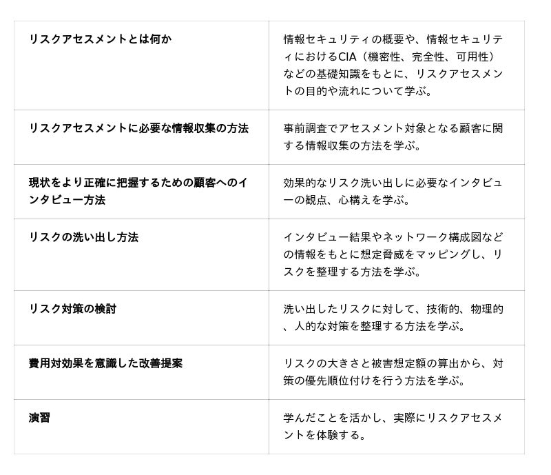 リスクアセスメントを単なる作業ではなく、重要なプロセスだということを学んでいただきました。加えて、日常生活に潜むリスクも知っていただくことで、サイバーセキュリティをより身近に感じていただけるように意識しました。