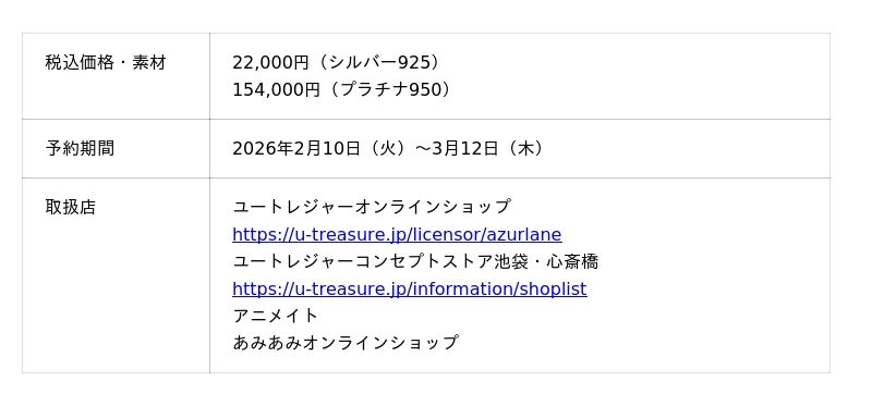 株式会社ユートレジャー(本社:東京都新宿区、代表取締役社長:青木 興一、株式会社ケイ・ウノの連結子会社)は、スマートフォン向けゲームアプリ「アズールレーン」とのコラボレーションアイテム「モチーフリング(指輪)」全3種類(雲仙、キアサージ、パーシュース)の予約受け付けを、2026年2月10日(火)~3月12日(木)の期間、ユートレジャーオンラインショップ、ユートレジャーコンセプトストア池袋・心斎橋にて行います。