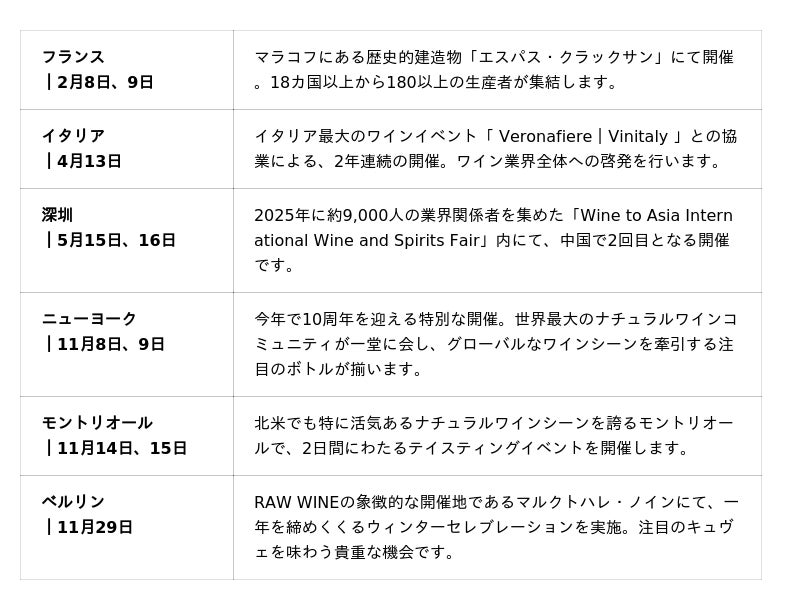 欧米を中心に世界10都市で行われている世界最大級のナチュラルワイン見本市「RAW WINE(ロウ・ワイン)」が、 2026年5月10日(日)・11日(月)の2日間、東京流通センター(東京モノレール・流通センター駅)にて開催することが決定しました。