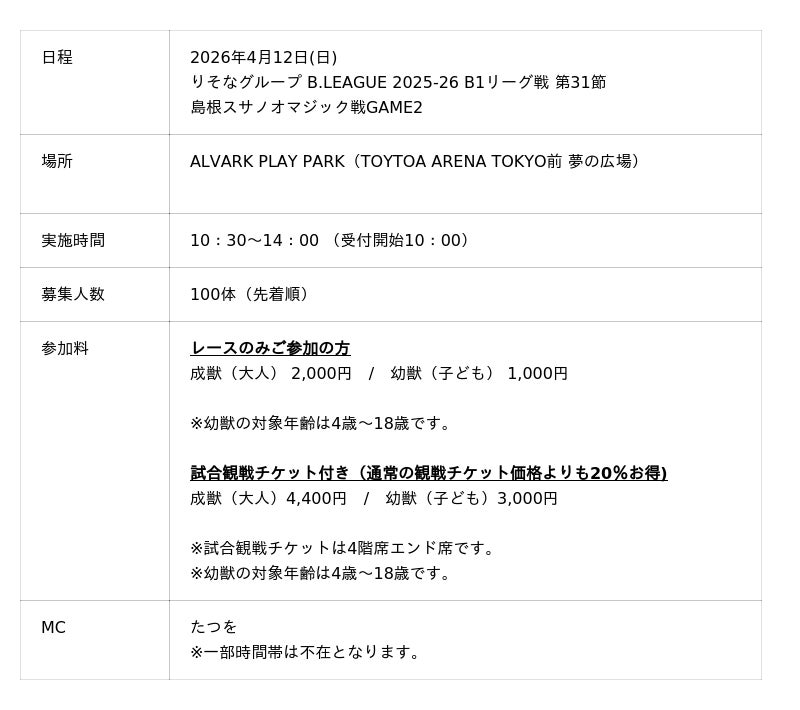 この度、4月12日(日) <島根スサノオマジック戦 GAME2>に、一般社団法人日本ティラノサウルス競技連盟公認レースとして、アルバルク東京史上初の開催が実現しました。