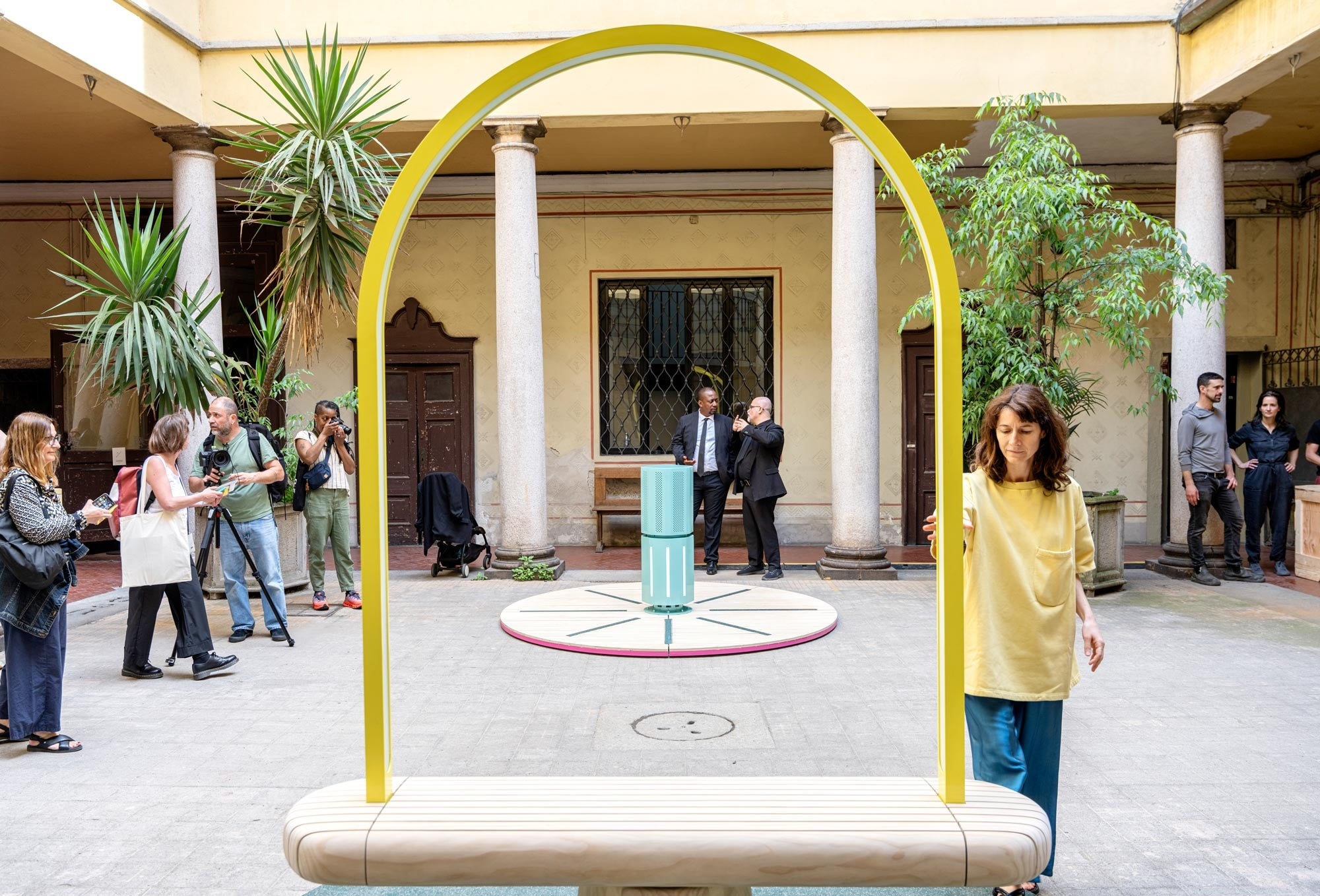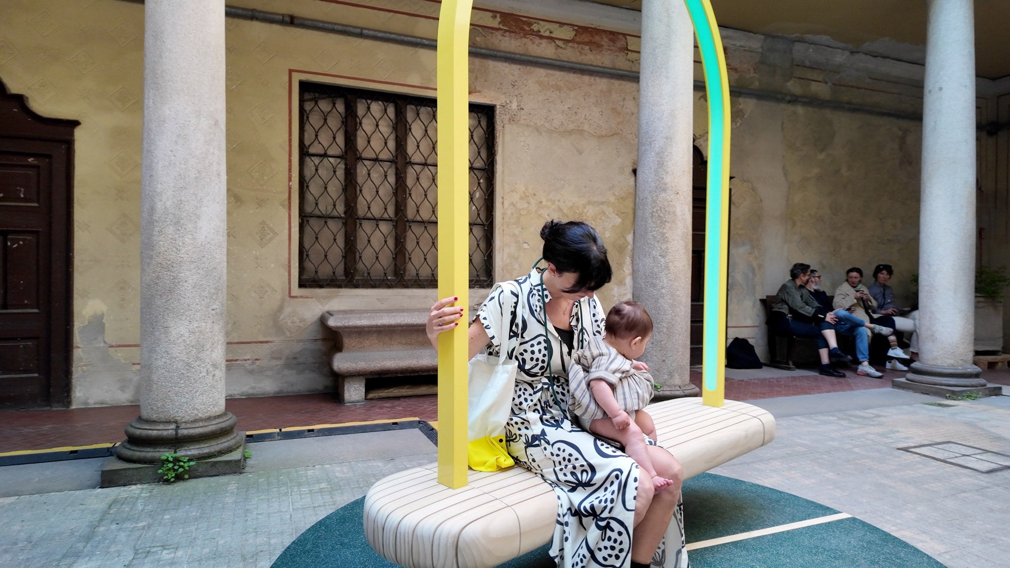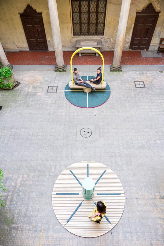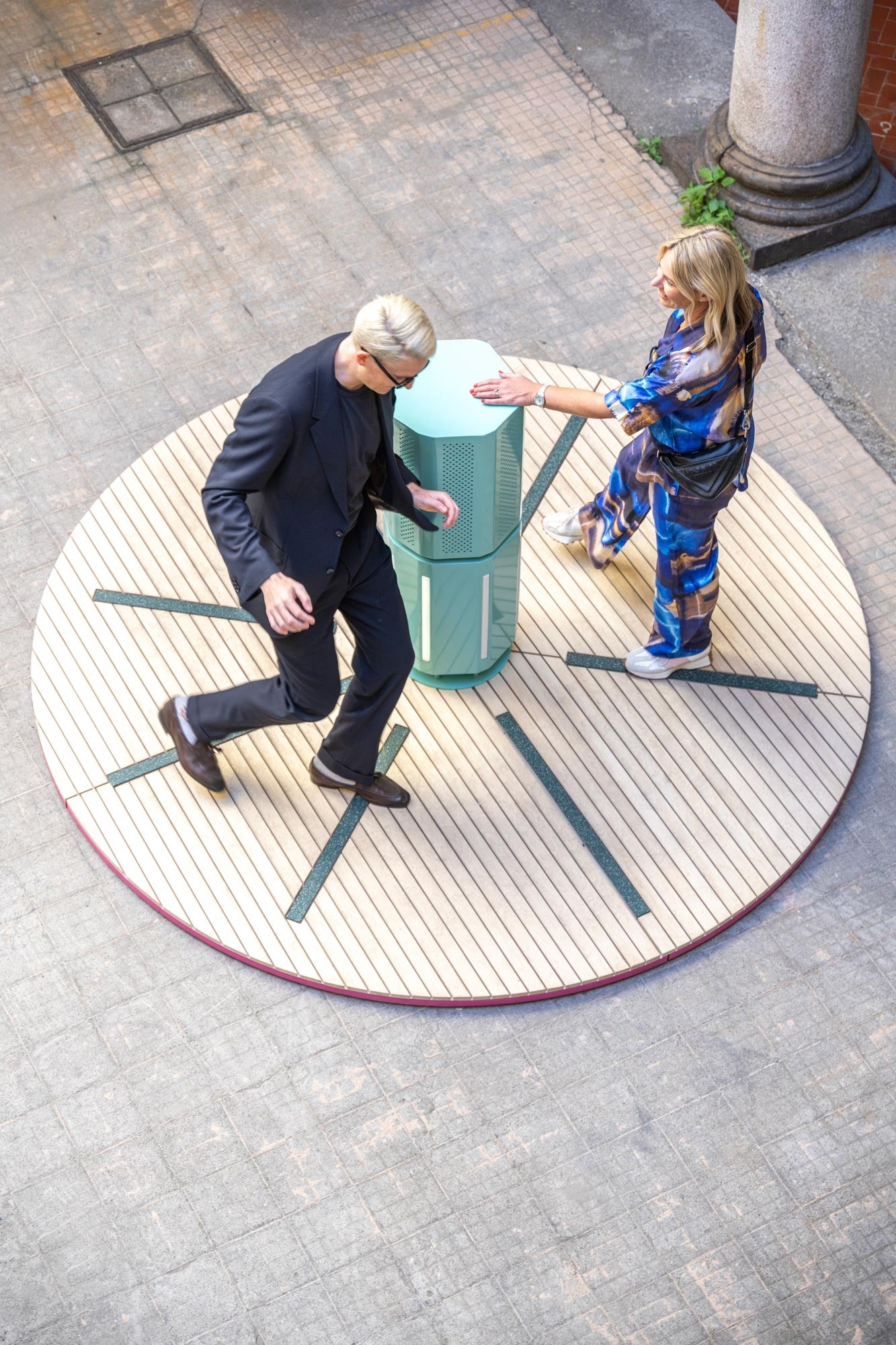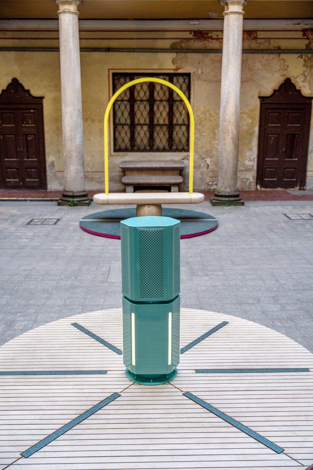 《Duetti》は人と人をつなぐアート作品です。イタリア語でデュエット(二重奏、二重唱)を意味するこの作品は、音を奏でるベンチとボラード(杭)の2つでできていて、それぞれの装置の中に音楽を鳴らす仕掛けがあり、そのときの動かし方やスピードによって音が変化して、唯一無二のデュエットを奏でます。スピードの速い都市を行き交う人々に、スローでリラックスできるひとときを過ごしてもらえたら、という意図で制作されました。