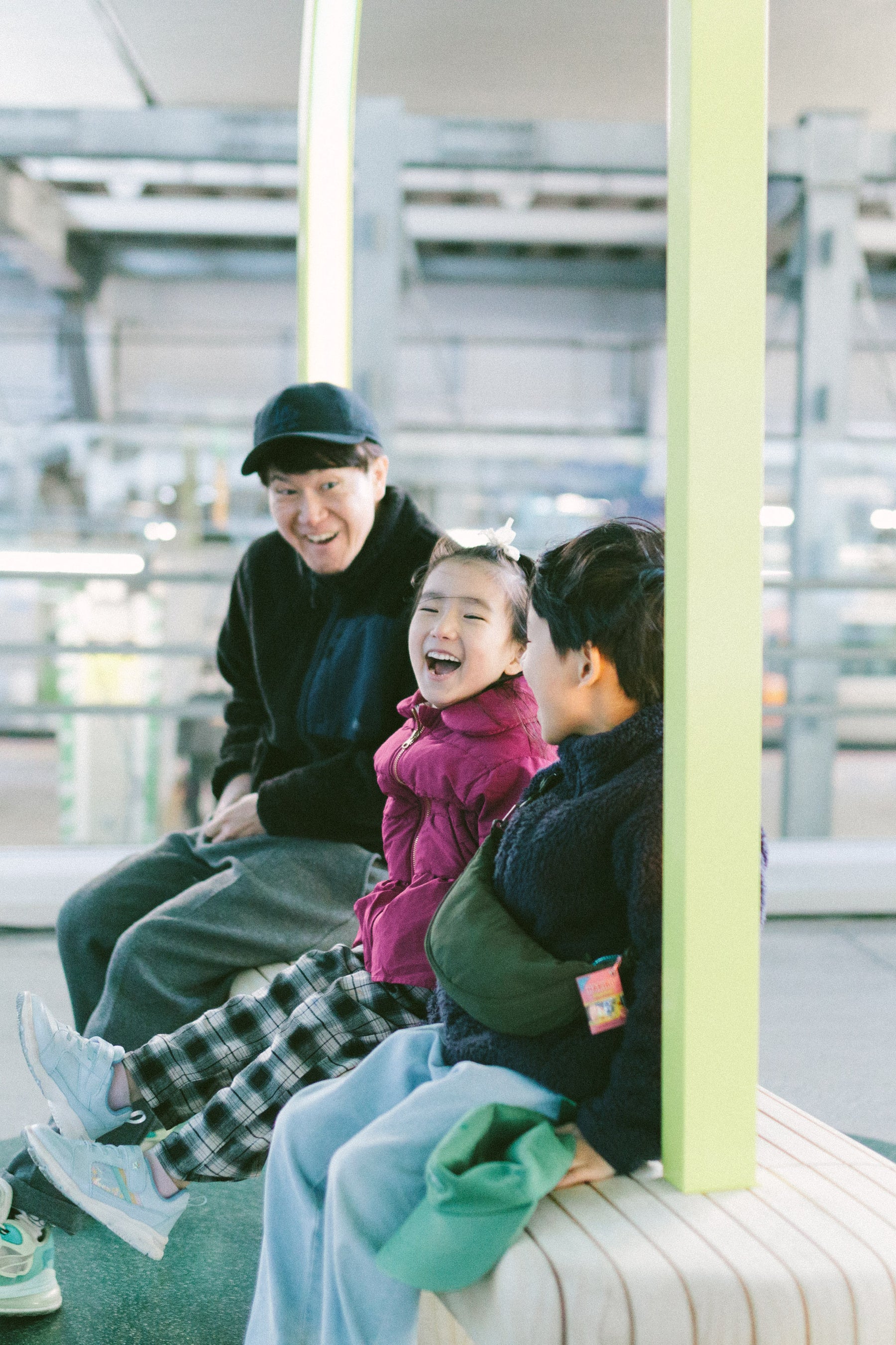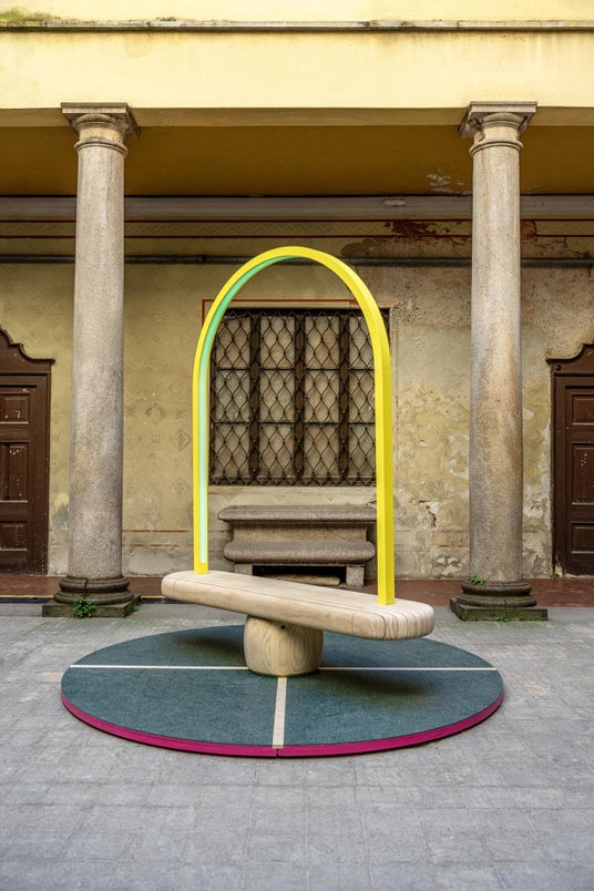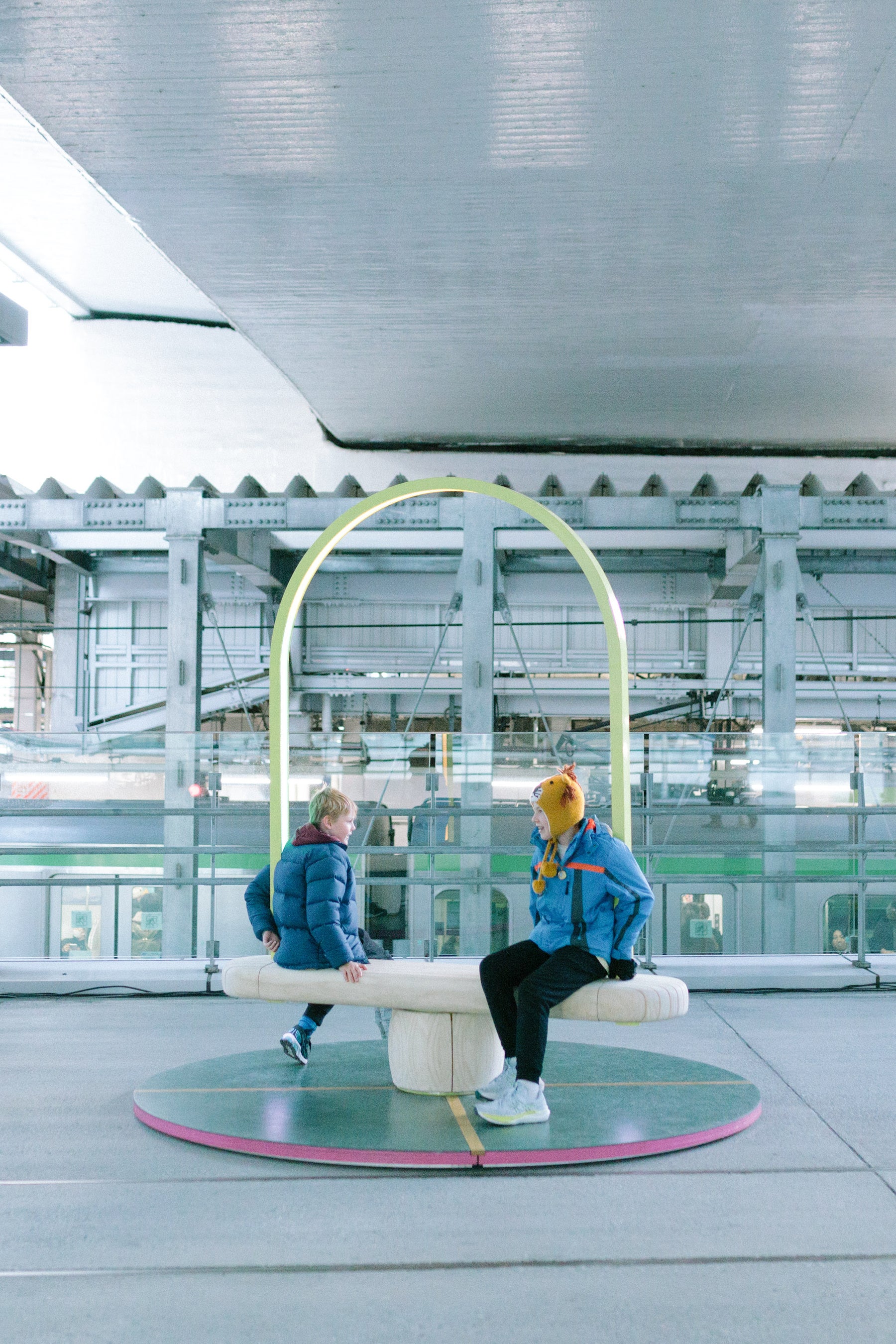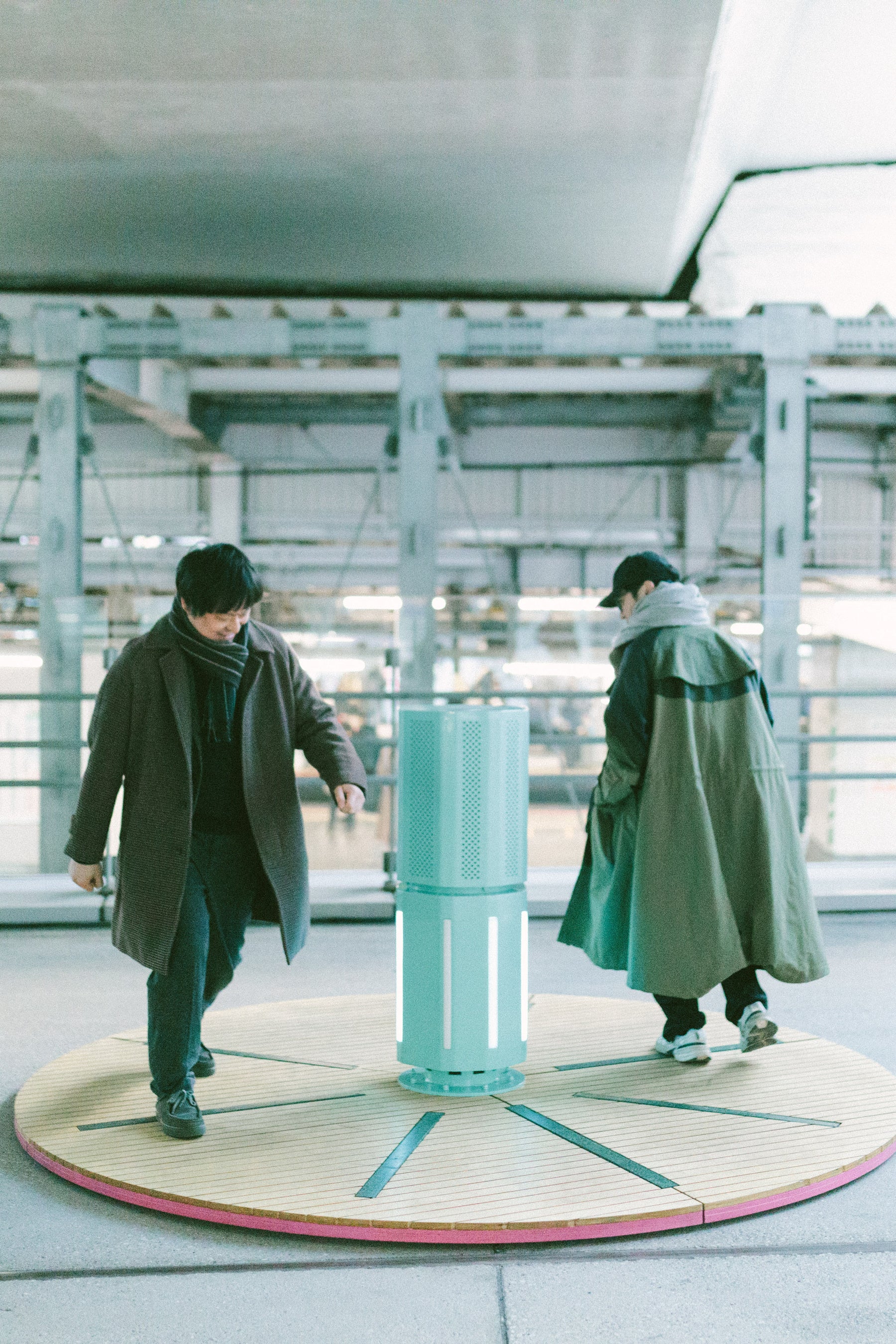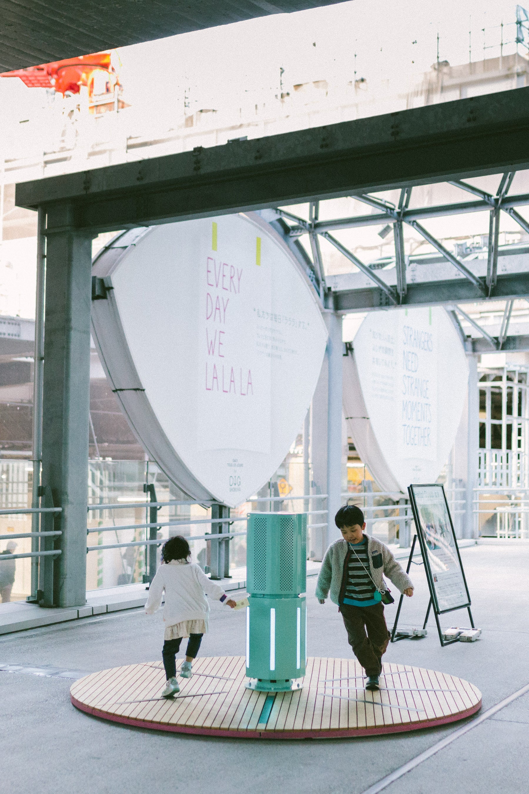 「今回、渋谷で制作できることをとてもうれしく思っています。というのも、東京を想像するとき、誰もがイメージする街が渋谷だからです。《Duetti》の設置場所は、国道246横断デッキ(旧東急東横線ホーム)です。中庭のような広がりのある空間ですが、少し奥まった場所でもあるので、いろんな人に気づいてもらえるように、かつて東横線渋谷駅のシンボルだった「カマボコ屋根」の下のパネルにキャッチコピーを看板にして掲げています。目的地に向かって忙しく行き来する人たちがふと目を留め、《Duetti》に乗って、つかの間でもストレスから解放されて楽しんでくれたらうれしいです。