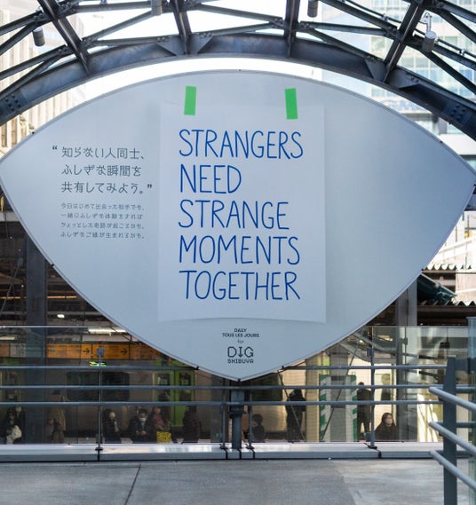 また、JR渋谷駅に隣接しているので、駅のホームや電車の窓からも看板や作品が垣間見えます。デッキを行き交う人だけでなく、駅にいる人や電車の中にいる人の目にちょっとしたショーのように見えたらいいですね。「何か面白そうなことが起こっているのかも?」と気づいてもらえたらうれしいです。」
