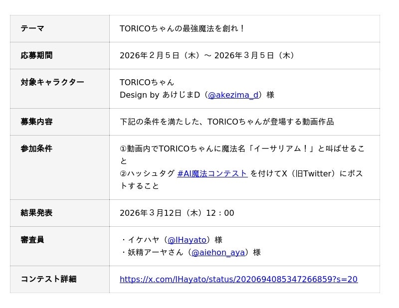 株式会社TORICO(本社:東京都千代田区、代表取締役社長:安藤拓郎、以下「当社」)は、当社の企業キャラクター「TORICOちゃん」を活用したユーザー参加型イベント「#AI魔法コンテスト」を開催することをお知らせいたします。