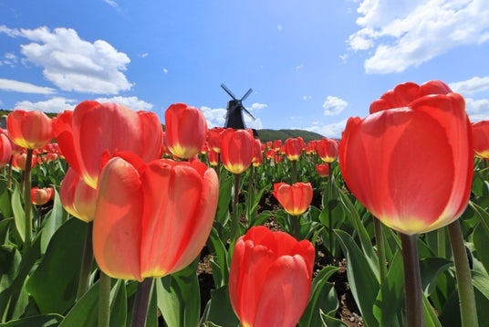 総面積12.5万平方メートル の広大な敷地に約200品種のチューリップが咲き誇る絶景スポット。赤や白、黄色など色とりどりの花々が一面に広がり、オランダ風の風車とともにヨーロッパのような風景を演出します。毎年5月に開催されるチューリップフェアでは、写真映えする景色やイベントも満喫できます。