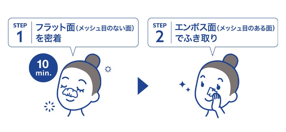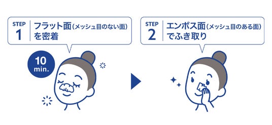 貼ってふき取る簡単2STEP!角栓溶解成分のトロメタミン*¹が毛穴*³詰まりの原因となる角栓を分解し、気になる黒ズミや過剰な皮脂をオフします。密着力の高い鼻型シートマスクが美容液の浸透*⁴をサポートし、つるんとなめらかな肌へ。