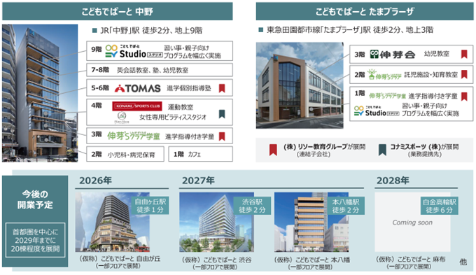 「こどもでぱーと」は、子育てや教育機能を集約し、子ども一人ひとりに合った最適なサービスを提供する施設です。また、コンシェルジュや送迎機能を設け、教育における保護者の不便や不安を解消するサービスも提供します。本施設での学びや体験を通し、子どもたちの好奇心を育み、一人ひとりの未来を創造することを目指します。現在、2025年4月に開業した「中野」・「たまプラーザ」に「自由が丘」・「渋谷」・「本八幡」・「麻布」を加えた6件が既に事業化済、2029年を目途に、首都圏を中心に20棟程度の事業化を目標に推進してまいります。(公式HP: https://kodomo-depart.jp/)
