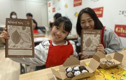 親子参加型のイベントとして、チョコレートの原料・製造工程を学ぶ授業に加え、「ガーナチョコレート」を使ったバレンタインレシピとして「トリュフ」、「カップチョコ」作りを体験いただきました。チョコレートは、カカオポッドと呼ばれる果実の中で育つカカオ豆が主な原材料の一つですが、本物のカカオポッドを前に授業を展開し、イベントの最後には、カカオ豆の皮(カカオハスク)をアップサイクルしたノート「ReCacao Note」をプレゼント。子どもたちは、普段食べているチョコレートの原料・製造工程に興味津々の様子で、あまり見ることのない本物のカカオポッドに驚きながら、カカオとチョコレートについて学びを深めました。