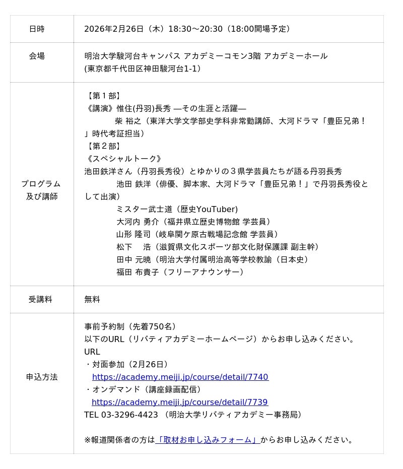明治大学の生涯学習機関「明治大学リバティアカデミー」は、2月26日(木)に公開講座「豊臣兄弟を支えた功労者・丹羽長秀 ~美濃、近江、越前から辿る生涯~《岐阜県・滋賀県・福井県共催講座》」を駿河台キャンパスで対面およびオンラインで開催します。事前予約制で、参加費は無料です。