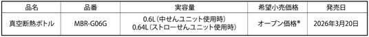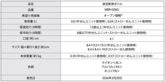 熱制御テクノロジーで世界をリードするタイガー魔法瓶株式会社(社長:菊池嘉聡、本社:大阪府門真市)は、「真空断熱ボトルMBR-G06G」を2026年3月20日(金)に発売いたします。