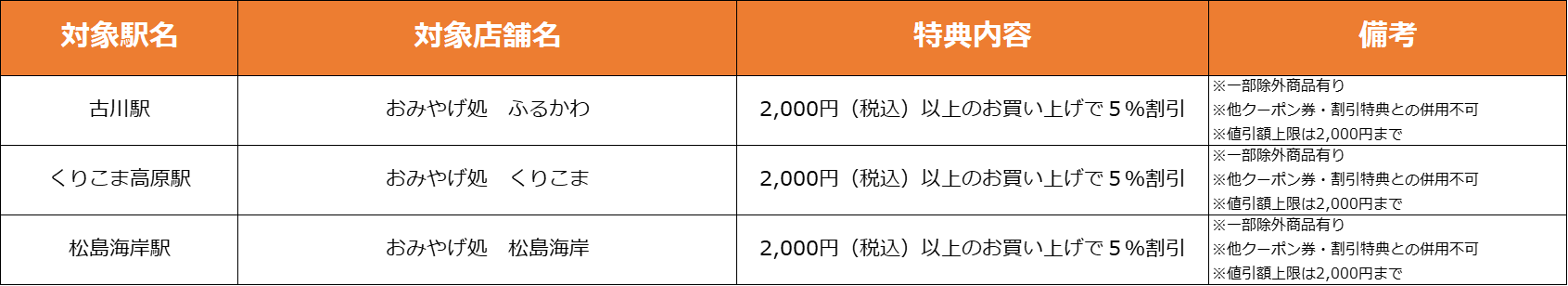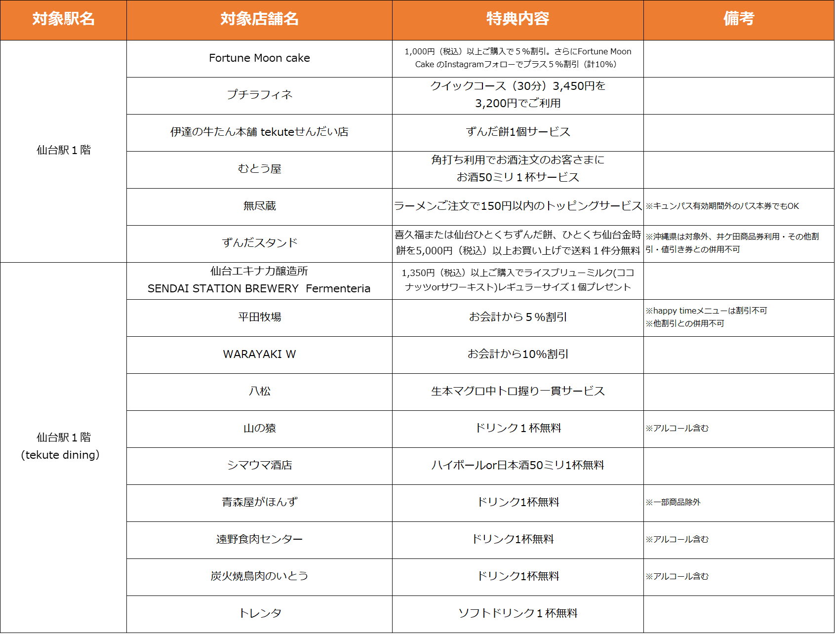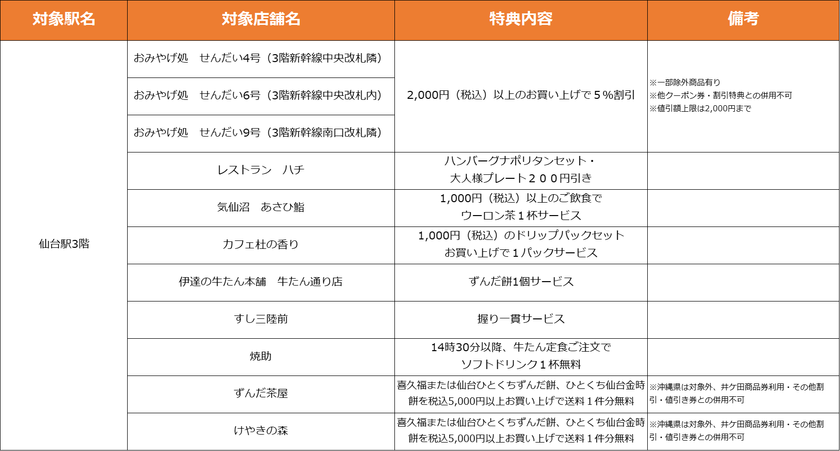 【仙台駅3F】特典対象店舗・特典内容
