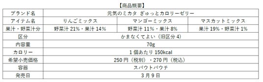 アサヒグループ食品株式会社(本社 東京、社長 川原浩)は、介護食「元気のミカタ ぎゅっとカロリーゼリー」3アイテムを3月9日から全国で発売します。