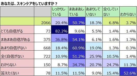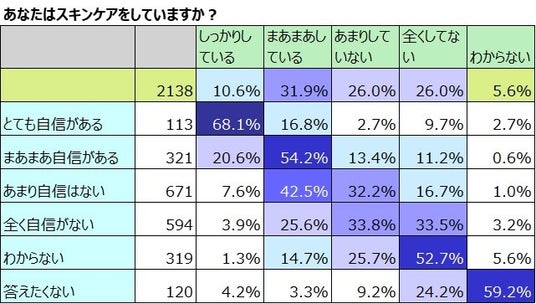 また、スキンケア習慣と肌への自信をかけ合わせて見てみました。男性は、「とても自信がある」と答えた人の68.1%が「しっかりスキンケアしている」と答えており、「まあまあ自信がある」と答えた人の54.2%が「まあまあスキンケアしている」と答えており、スキンケア習慣と肌への自信はリンクする傾向が見られます。女性で見ていると、「とても自信がある」と答えた人の82.2%が「しっかりスキンケアしている」と答えており、男性よりも高い割合です。「まあまあ自信がある」人の54.1%が「まあまあスキンケアしている」と答えていますが、「あまり自信がない」人の60.9%、「全く自信がない」人の51.2%が「まあまあスキンケアしている」と答えていることから、男性よりも女性の方がスキンケア習慣と肌への自信の相関が薄い可能性が考えられます。