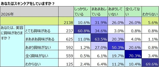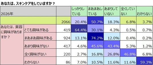次に、スキンケア習慣と美容への興味をかけ合わせてみました。男性は、スキンケア習慣と美容への興味がきれいにリンクしていることがわかります。女性は、「美容にあまり興味がない」と答えながらも、ボリュームゾーンはスキンケアを「まあまあしてる」と答えているため、男性よりも義務感や、スキンケアを「するものだ」と思ってしている人が多いことが想像され、男女を比較すると男性の方が興味と行動が素直に繋がっているではないかと思われます。
