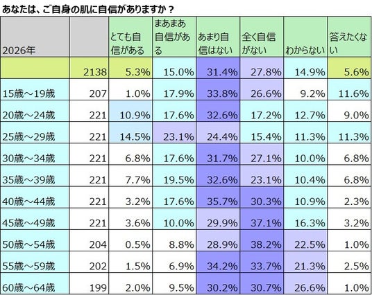 次に自分の肌に自信があるか否か聞きました。(この調査は過去に同様の調査をしていないため、比較資料はありません)まず、男性の全体でみてみると「とても自信がある」5.3%と「まあまあ自信がある」15.0%で20.3%が「自信がある」と答えています。年齢別では、最も「自信がある」のが多いのは20代後半で、37.6%と4割近くにも上ります。ほとんどの世代が「自信がある」人よりも「自信がない」人の方が圧倒的に多いのですが、この世代に限っては「自信がある」37.6%と「自信がない」39.8%であるため、ほぼ同率と言うことができます。