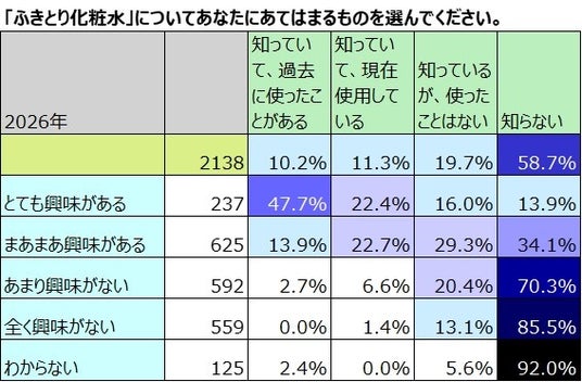 株式会社ナリス化粧品(代表者:村岡弘義 本社:大阪市福島区)は、主力商品である「ふきとり化粧水」の認知度や使用実態を含む男女のスキンケアや美容に関する意識調査を行いましたので以下にまとめます。当社は1937年に角層ケアを目的としたふきとり化粧水「ナリス コンク」の発売以降、角層研究に注力しています。これまで、ふきとり化粧水の国内販売動向調査を実施しており、2025年4月に実施した調査では10年連続販売シェアがNo.1です。(調査会社:TPCマーケティングリサーチ株式会社 2015年4月~2025年3月実績 調査実施2025年4月)2016年以降は、当社が日本記念日協会に申請し認可された2月10日の「ふきとりの日」に、ふきとり化粧水に関する情報発信を行っています。今回は男女約4,200名に行ったスキンケアや美容に関する意識や、ふきとり化粧水の認知度・使用率について過去の調査との比較・変化も含めて以下に内容をまとめます。(実施期間:2026年1月16日~2026年1月30日 調査方法:インターネットによる自社調査)内容によって回答者数が異なるため、n数は各図表に記入している数字を参照してください。過去の調査はグラフを省き、数字データのみのものも含みます。※当社が過去に行った調査で初めて