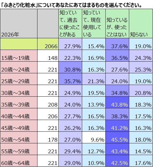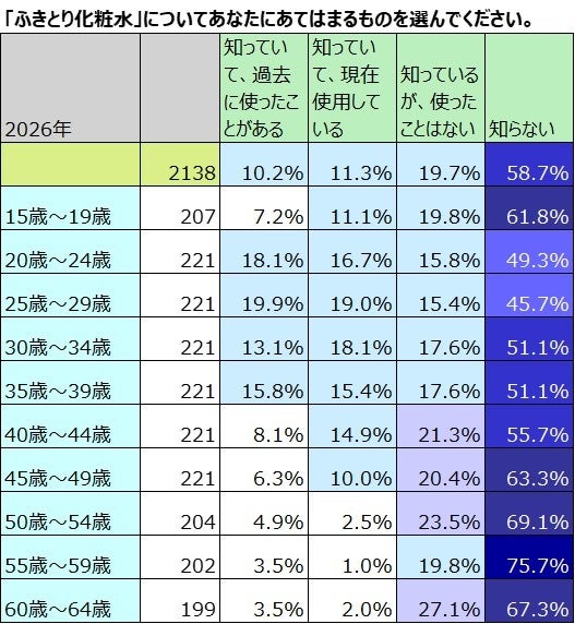 女性でみてみると、知っている人の合計は、2024年81.8%で今回が81.0%であるため、横ばいもしくは微減であり、この2年間で大きな変化はないと言えます。当社は、認知促進活動を実施しておりますが、まだまだしっかり浸透させるところまでは至っていないと言えます。対象年齢と人数が異なるため、参考値ですが、当社が2018年2月5日に発表した20歳~69歳の1200名の女性を対象にした調査では、「現在、ふきとり化粧水 を使用している」人は15.0%で横ばい基調であると言 えます。