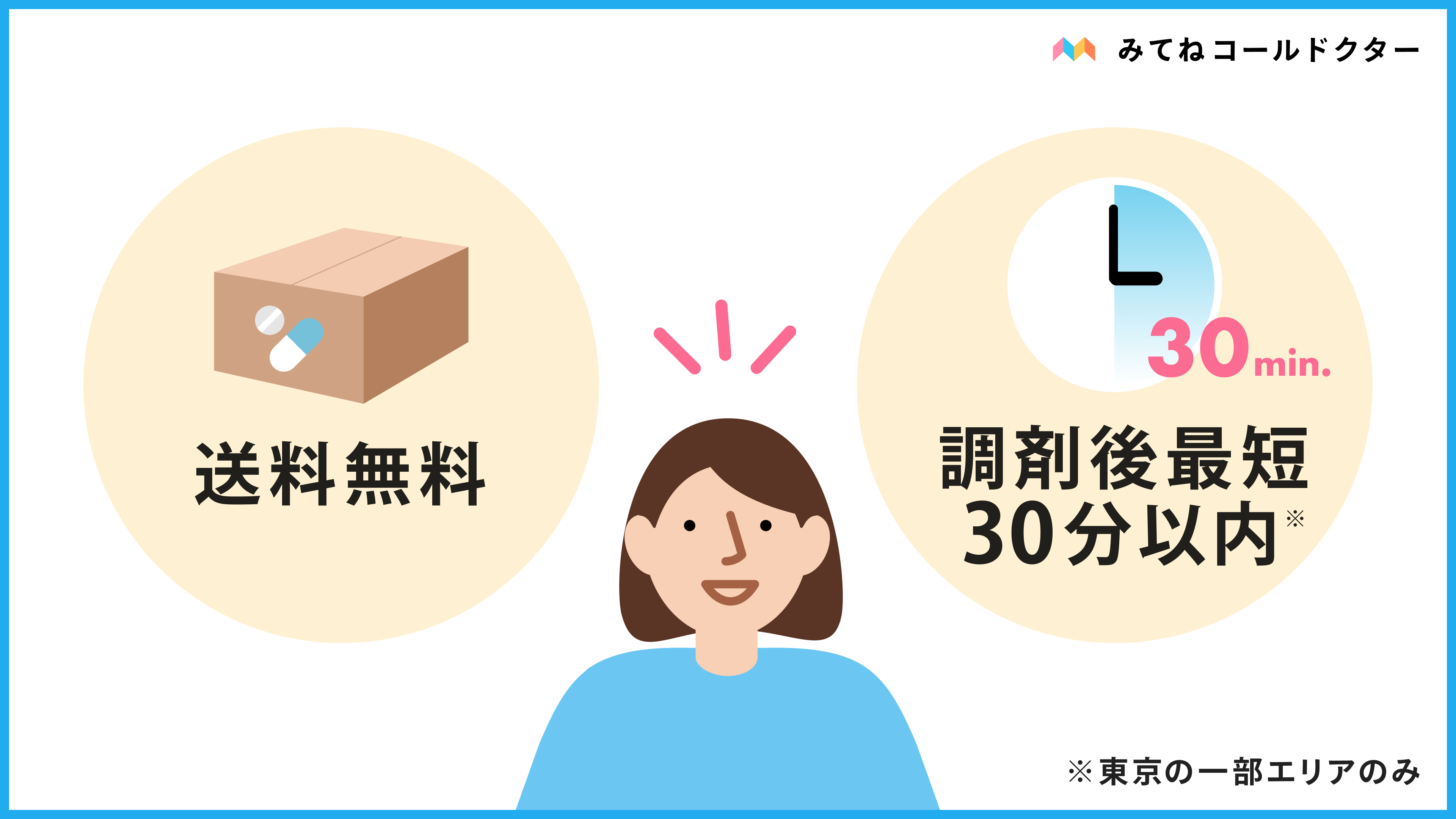 保険診療のオンライン診療後、処方薬を全国(*1)送料無料で配送。東京一部エリアは調剤後最短30分でお届け。