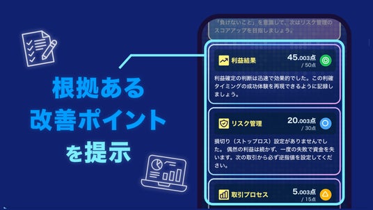 次の行動に繋がるフィードバックを提供独自のロジックが、改善点を科学的に分析。感覚に頼らない「根拠あるアドバイス」でトレード技術の向上をサポートします。