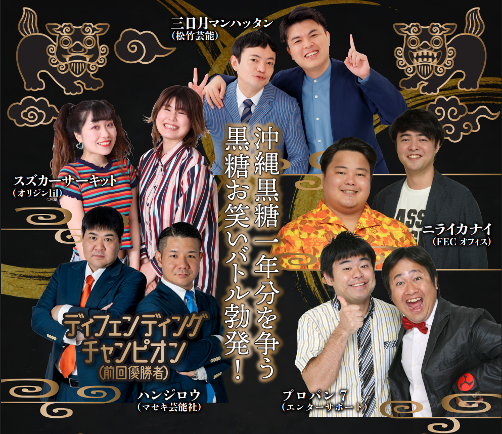 本イベントは、これまでリーチしたことがない消費者への沖縄黒糖の周知を目的とし実施いたします。第3回目の開催となる今年は、消費者からもアクセスしやすいパレットくもじ前交通広場にて行います。沖縄にゆかりのある5組の芸人が沖縄黒糖のネタのみで争い、審査員と来場者による投票で審査、優勝者には1年分の沖縄黒糖が贈呈されます。