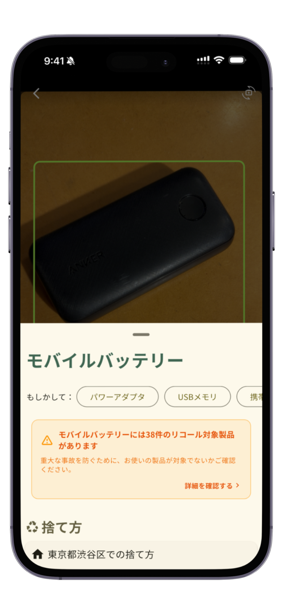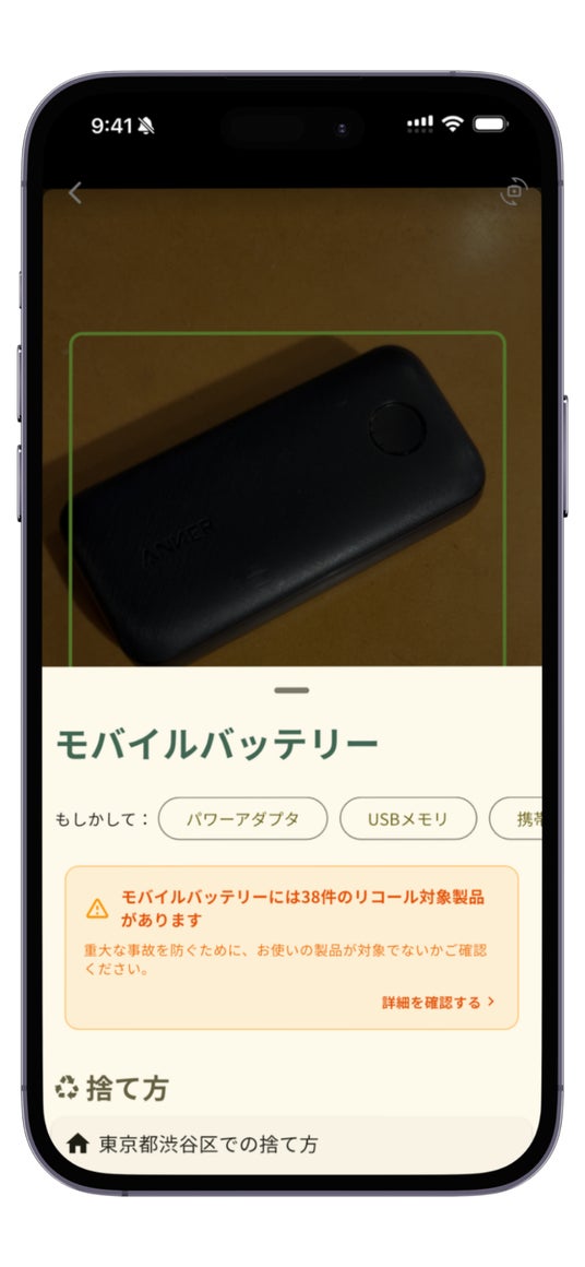 この度「Trash Lens」に追加されたリコール情報確認機能では、モバイルバッテリーをスマートフォンで撮影するだけで、AIが画像から型番やメーカー情報を読み込み、関連するリコール情報の有無を即座に表示します。リコール対象製品であった場合は、メーカーの回収窓口やリコール詳細ページへのリンクを提示し、ユーザーが速やかに対処できるようサポートします。また、リコール情報が見つからなかった場合でも、お住まいの自治体での分別情報や、適切な廃棄方法を確認することが可能です。