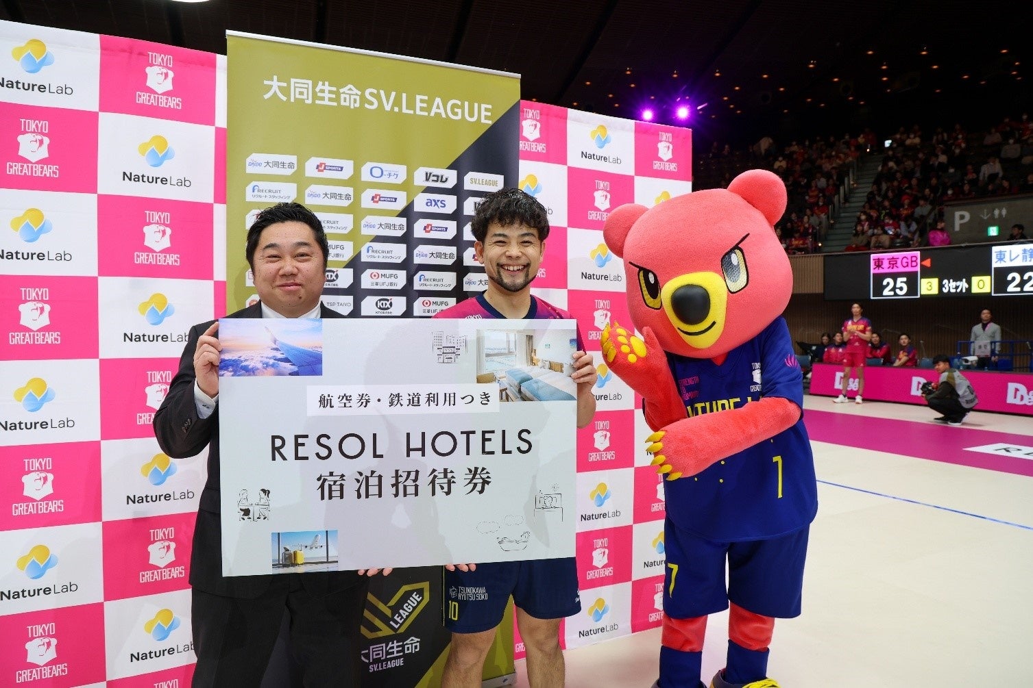 今回で2回目の実施となる「RESOL HOTELS DAY」では、会場内での「リソルホテルズ」の紹介に加え、来場者さまにRESOL HOTELSオリジナルグッズをプレゼントいたします。さらに、両日のPOM(Player of the match)受賞選手には、航空券・鉄道利用とRESOL HOTELSの宿泊(全国20ホテルから選択可能)がセットになった宿泊招待券を贈呈します。