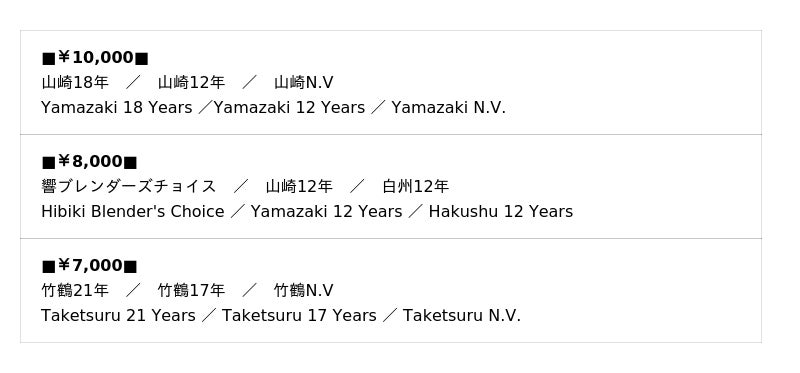 厳選された3種類のジャパニーズウイスキーを、それぞれ20mlずつのテイスティングサイズでご提供いたします。稀少な銘柄をこの機会にぜひ、ご堪能ください。We offer three carefully selected Japanese whiskies, each in a 20ml tasting size. Please take this opportunity to savor these rare brands.