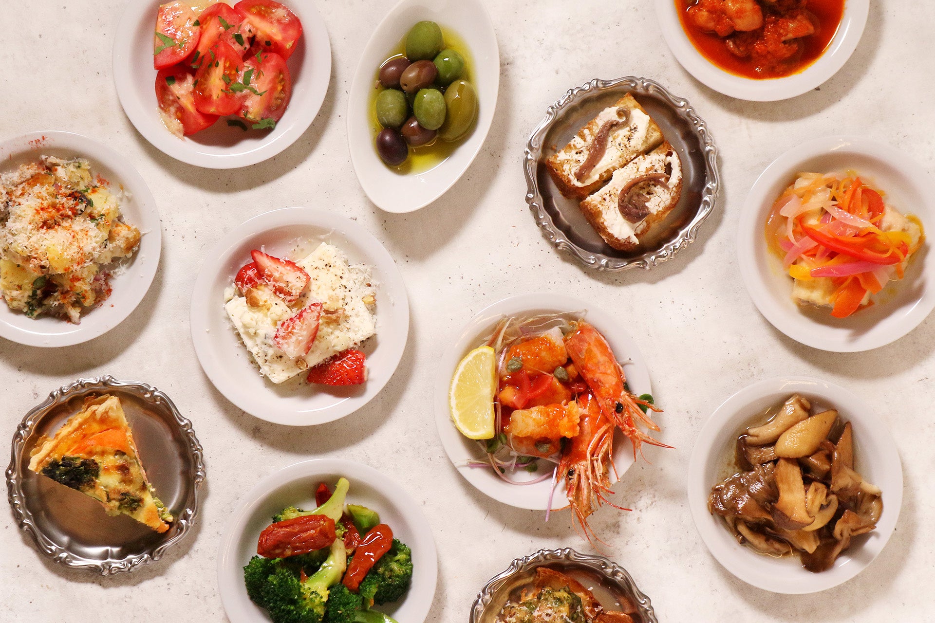 店内のショーケースに並ぶイタメシタパスの数々。気軽にお酒とおつまみを楽しむ、イタリアの”バーカロ”のようなカジュアルなスタイルで昼夜問わずお楽しみ頂けます。