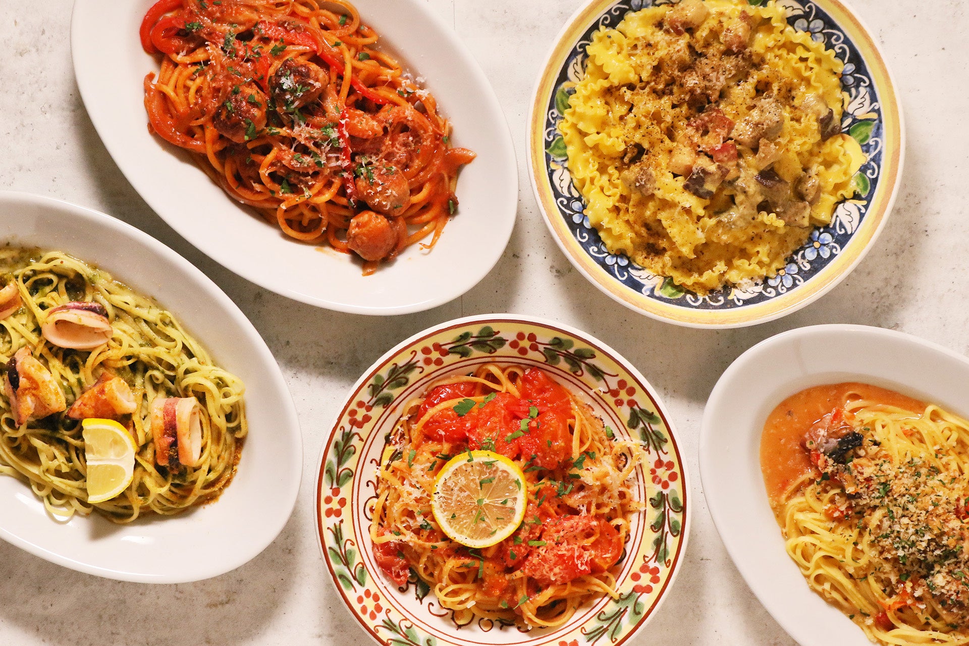 自慢のフレッシュなパスタを素材の持ち味や季節の食材を活かしたソースと一緒にお楽しみください。