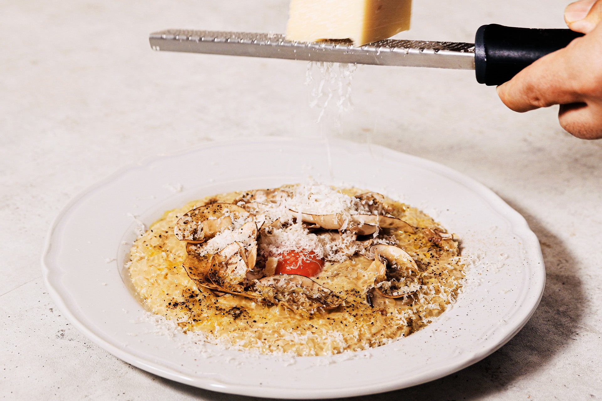 ポルチーニ茸と舟形マッシュルーム、龍の玉子のパルメザンチーズリゾット