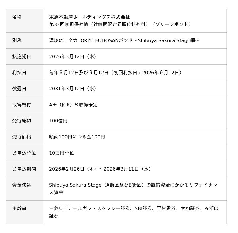 東急不動産ホールディングス株式会社(本社:東京都渋谷区、代表取締役社長:西川 弘典、以下「当社」)は、個人向け社債「環境に、全力TOKYU FUDOSANボンド~Shibuya Sakura Stage編~」の発行(以下、「本発行」)を予定しておりますので、お知らせいたします。