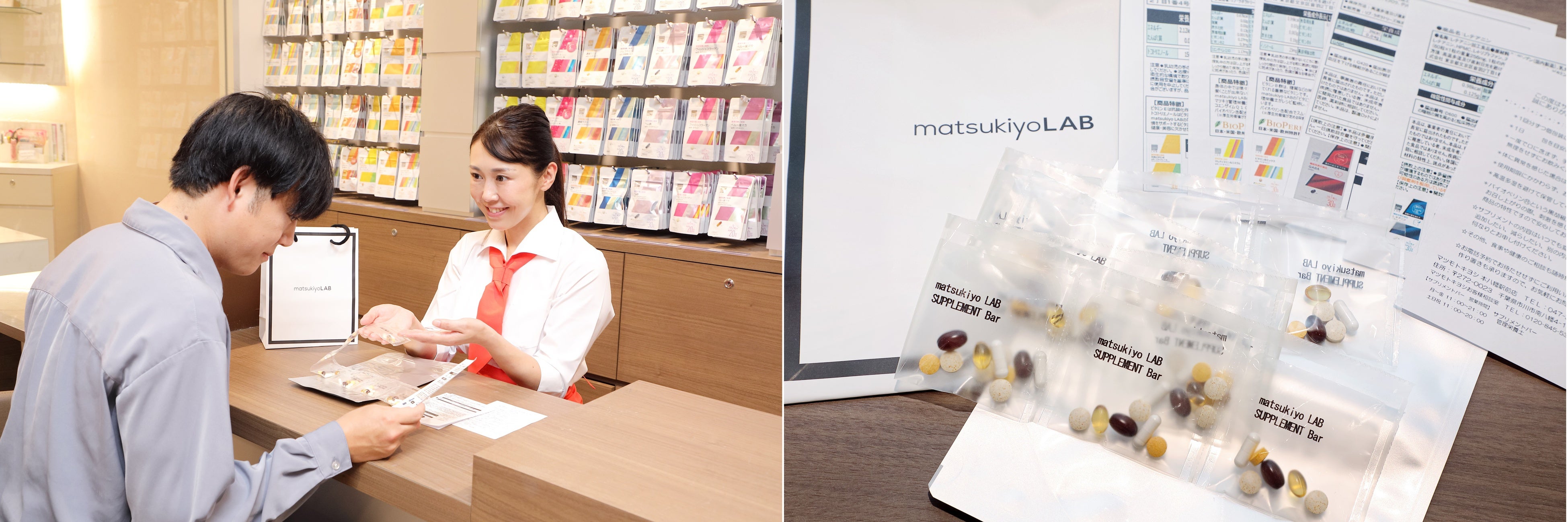 matsukiyo LABで展開している「SUPPLEMENT Bar(サプリメントバー)」は、店舗に常駐する管理栄養士がお客様一人ひとりの食生活や生活習慣を丁寧にカウンセリングし、不足しがちな栄養素を見極め、最適なサプリメントをオーダーメイドで分包・提供するサービスです。