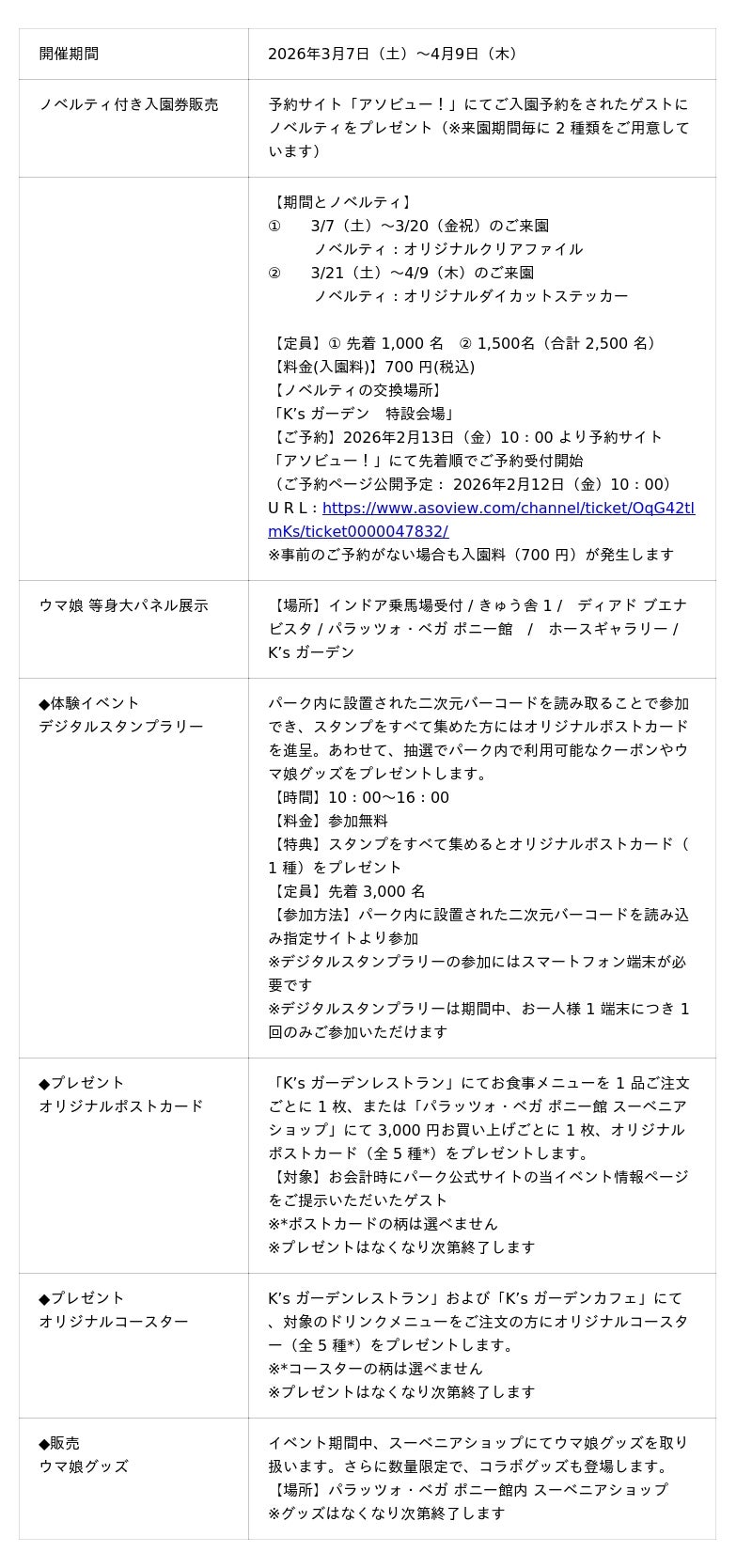 また、予約サイト「アソビュー!」から予約をされたゲストには、コラボレーション限定の入園ノベルティを前後半、合計先着2,500名にプレゼントをご用意しています。そのほかレストランやショップでもイベント期間限定の企画を展開し、園内各所でウマ娘とのコラボレーションをお楽しみいただけます。さらに、2026年3月28日(土)には、ノーザンホースパークで初となるウマ娘キャストによるトークショーを全3回開催※します。シュヴァルグラン役・夏吉 ゆうこ氏、ブラストワンピース役・紫月 杏朱彩氏を迎え、作品やキャラクターへの想い、ここでしか聞けないエピソードを語っていただきます。参加者には、イベント限定のオリジナルアクリルキーホルダーをプレゼントします。