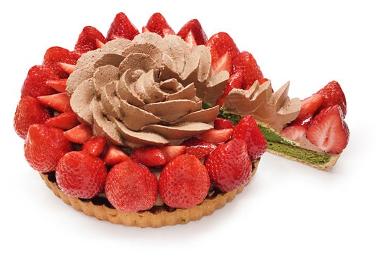 福岡県産の「あまおう」とチョコレートクリームをあわせて、八女抹茶のベイクドチーズケーキに