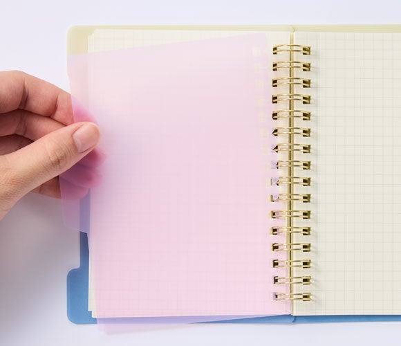 付け替え可能なインデックス&5mm方眼で整理がしやすいノート付け替え可能なインデックスが3枚が付いた、持ち運びに便利なA6サイズのノートです。