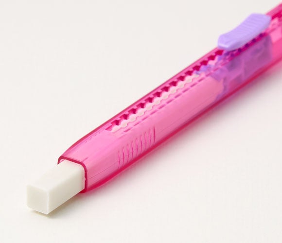 ペンのようにスマートに持ち運べる消しゴムです。スライド式で、角を使えば細かい部分もきれいに消せます。