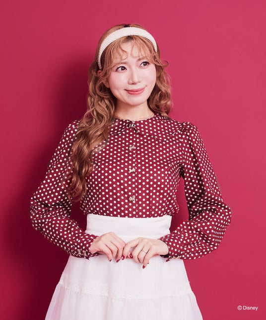 また、リボン型のボタンをあしらったトップスは、2型ラインアップ。肩の立体的なシルエットがレトロで可愛いブラウスには、「ミニーマウス」をイメージしたスカラップ風の襟を採用。軽やかな質感のニットカーディガンには、UVカット加工を施し、春のお出かけにも嬉しい機能性をプラスしました。