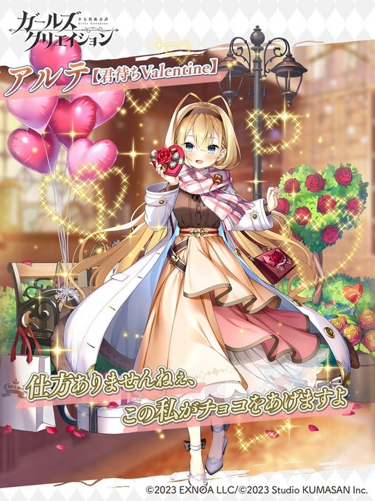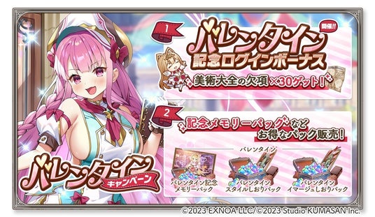 「美術大全の欠頁」を最大×30獲得できるログインボーナスや、期間中、エントランスで設定したキャラクターおよび執務室のサンソヴィーノにおいてバレンタイン期間限定のボイスをお楽しみいただけます。