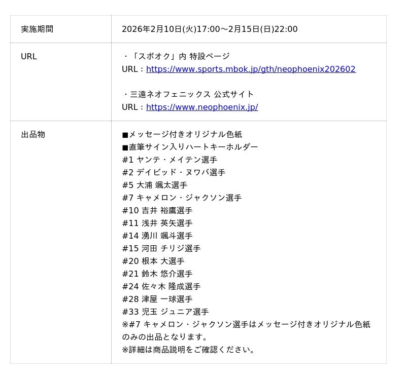 株式会社モバオク(本社:東京都渋谷区、代表取締役社長:小一原 宏樹、以下モバオク)がエンゲート株式会社(本社:東京都中央区、代表取締役:城戸 幸一郎、以下エンゲート)と業務提携し提供するスポーツチーム公式オークションサービス「スポオク」にて、B.LEAGUE所属の三遠ネオフェニックスが実施する『三遠ネオフェニックス 2026 バレンタインオークション』を2026年2月10日(火)から開始します。