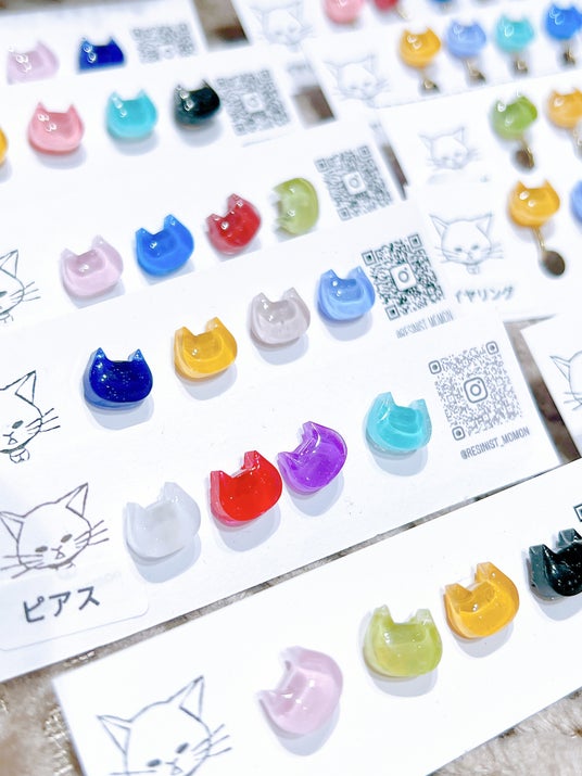 「momon」のアクセサリーは、きらきら輝くカラフルな猫たちが主役。繊細なラメやスワロフスキー、琉球ガラスのかけらをあしらい、光を受けるたびに美しくきらめきます。猫好きな大人の女性が、日常にさりげなく取り入れられる上品なかわいさが魅力です。