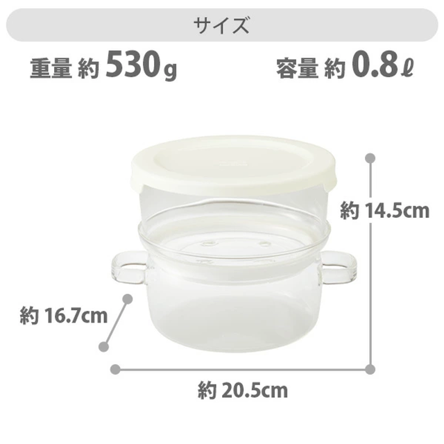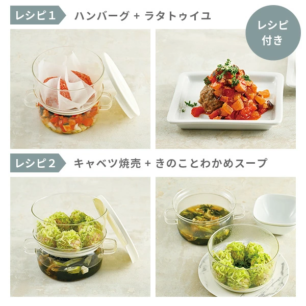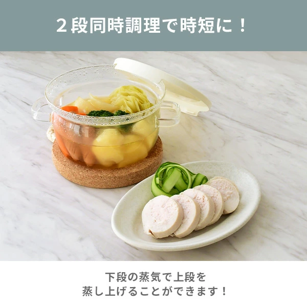 上下ともに耐熱ガラス製の調理器具。電子レンジで手軽に蒸し料理が作れ、一度の加熱で上下二段で主菜と副菜の調理ができて便利です。
