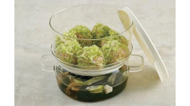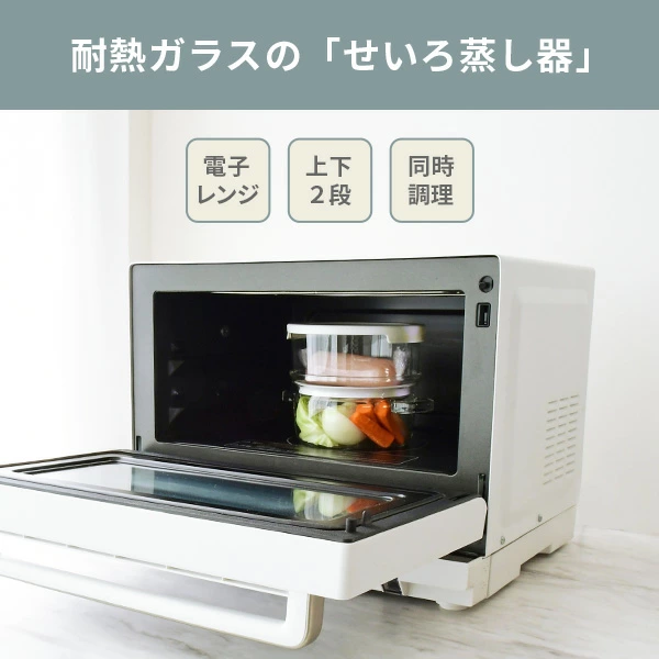 下のガラス容器に水を入れて、上の容器に蒸したい食材を入れるだけ。電子レンジで加熱後に、庫内で数分蒸らせば美味しい蒸し料理の完成です。