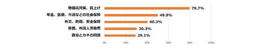 衆院選後の国会で優先して議論し、取り組んで欲しいと思う政策、テーマを複数回答で聞くと、上位5位は、「物価高対策、賃上げ」79.7%、「年金、医療、介護などの社会保障」49.9%、「外交、防衛、安全保障」40.3%、「移民、外国人労働者」30.3%、「政治とカネの問題」29.1%だった。